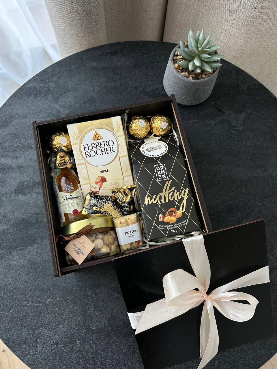 “Gold” — це поєднання мужнього характеру та витонченого задоволення. Усередині — делікатесні солодощі, натуральні горішки, мініатюра міцного напою та вишукане оформлення, що підкреслює ваш бездоганний смак.
